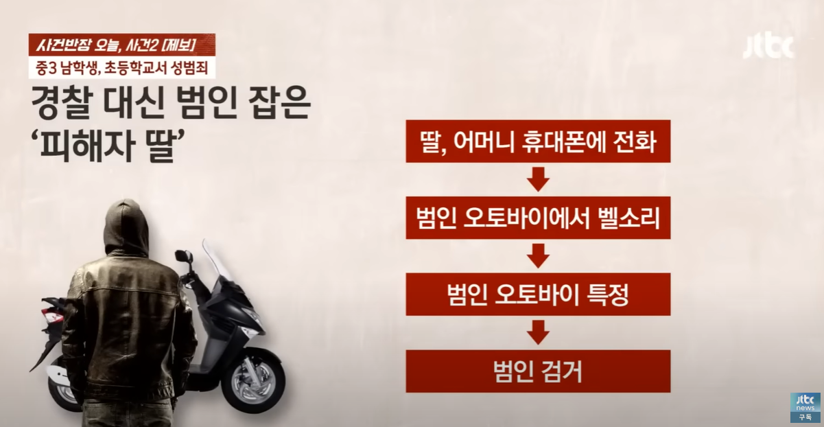 휴대폰의 위치를 파악한 후 인근에서 범인의 오토바이를 발견하고 범인의 오토바이에서 엄마의 휴대전화 벨소리가 울리는 것을 알고는 경찰에 신고해서 당일 오후에 범인을 검거하게 됩니다.